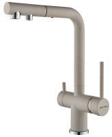 Смеситель оснащен гибким выдвижным изливом из нейлоновой оплетки, которая обладает отличной устойчивостью к истиранию и разрушению. Данная техническая особенность расширяет рабочую зону смесителя, позволяя пользоваться им с удобством в больших мойках, мойках с двумя чашами, или наполнять водой ёмкость на столе рядом с мойкой, в том числе питьевой водой.